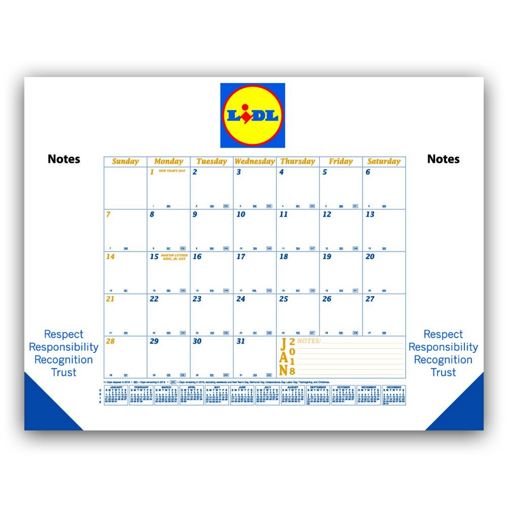 22x17 Desk Pad Calendar with Blue & Gold Grid & 3 Imprint Areas custom printed with your advertising message in 1 or 2 standard colors, on 60 lb. Titanium Bright White Paper stock for oustanding imprint quality.