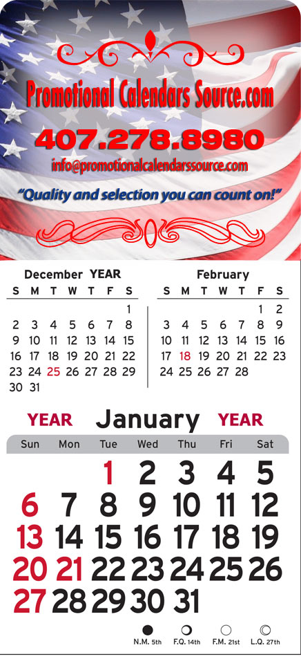 Full Color Stick Up Calendar with stock 3 Months In View Black & Red Calendar Grid and large header.