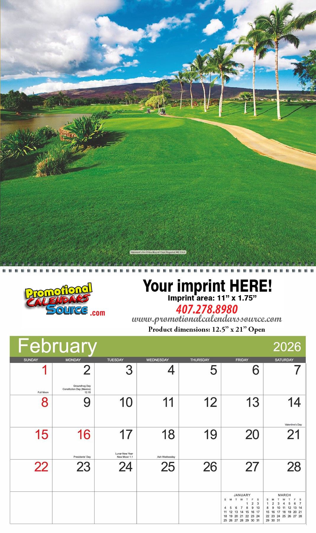 Putting Green Golf Courses Calendar 2027, Spiral, 12.5x21 Open and has spiral binding. Built with high quality paperstock, (Cover is 110 lb. Gloss Cover Stock with UV Coating; Pad is 75 lb. Gloss Cover Stock with UV coating), and customizable from a single color to Full-Color imprint for your advertising copy. Colorful refreshing images decorate this appointment wall calendar, a 12 month calendar of great quality. The attractive and different desing, will certainly attract attention and be admired all year long, promoting your advertising message. Custom printed with your business information and logo for a year long exposure will be a great and appreciated gift.