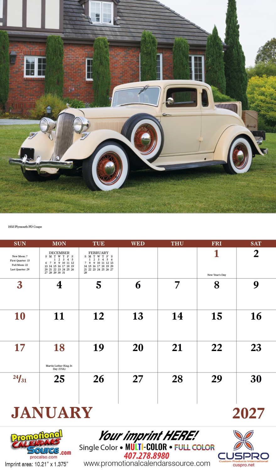 Antique Autos Promotional Calendar Stapled. Classic, elegant autos from an era when style reigned supreme. Perfect promo calendar to be personalized for car repair shops, car dealers, automotive industry professionals.
