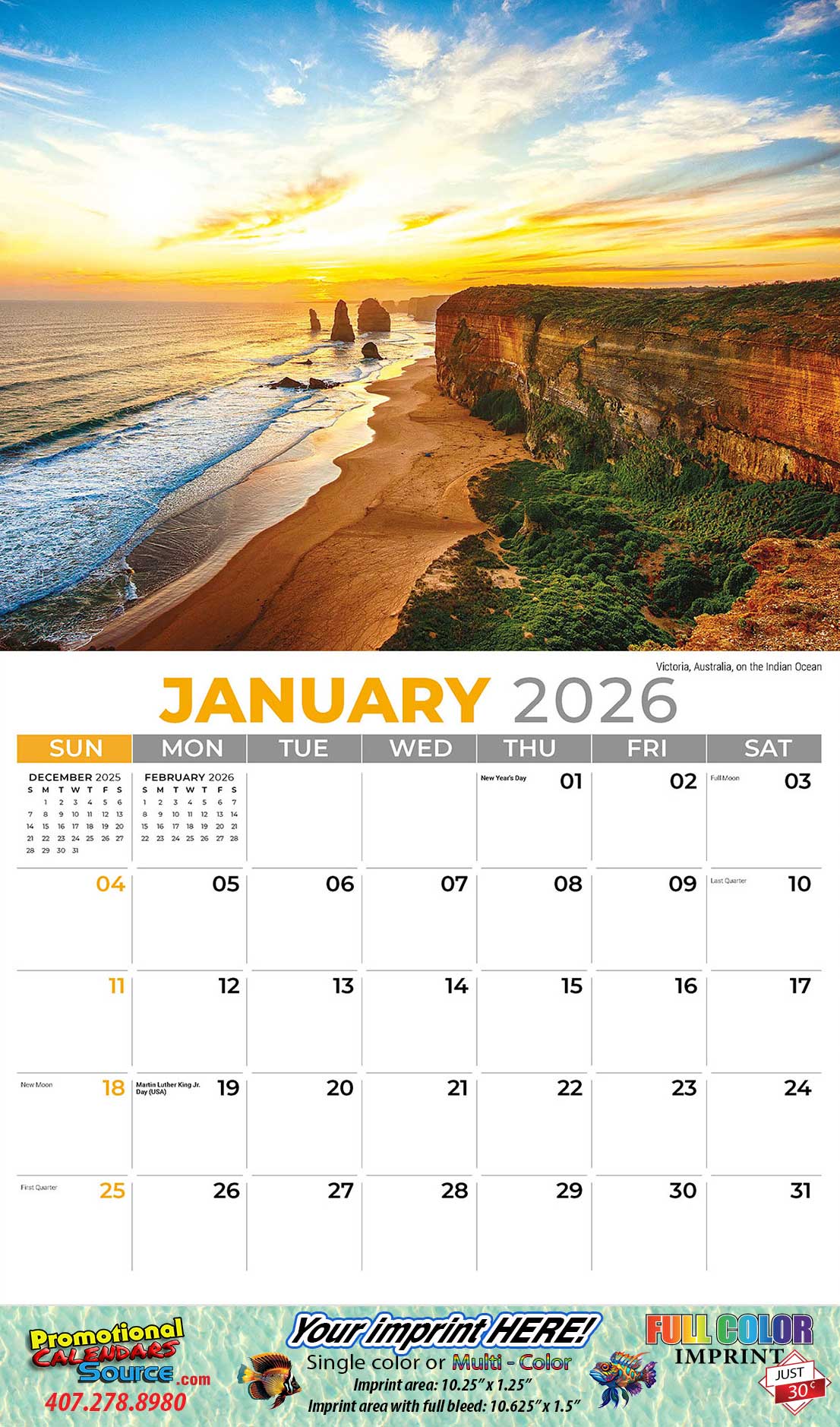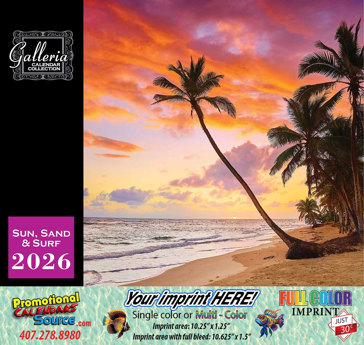 Beaches, Sun and Ocean Views Promotional Calendar - filled with beautiful imagery that will be admired allyear round side by side with your advertising message.