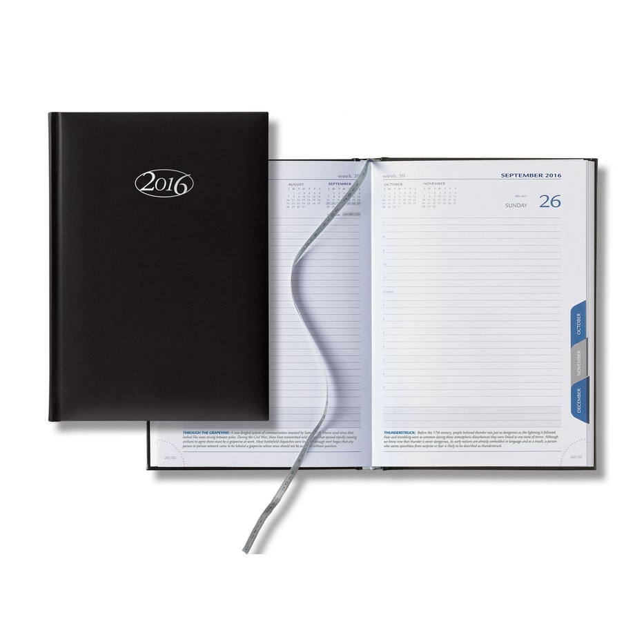 The Castelli Tabbed Mid Size Daily Includes: 416 white lined pages with time reference in modern blue and gray print. A tab separates each month where each page includes perforated corners, a month at a glance in three month sections. A silver ribbon marker with printed year date and an extensive reference section in the back that includes National and International Holidays, maps, exchange tables, and important reference lists. Matra provides a quality high-grade polyurethane option, a cover that features a smooth surface with a matte finish. Contact us with your design needs so we can assist you finalize the details of your calendar.