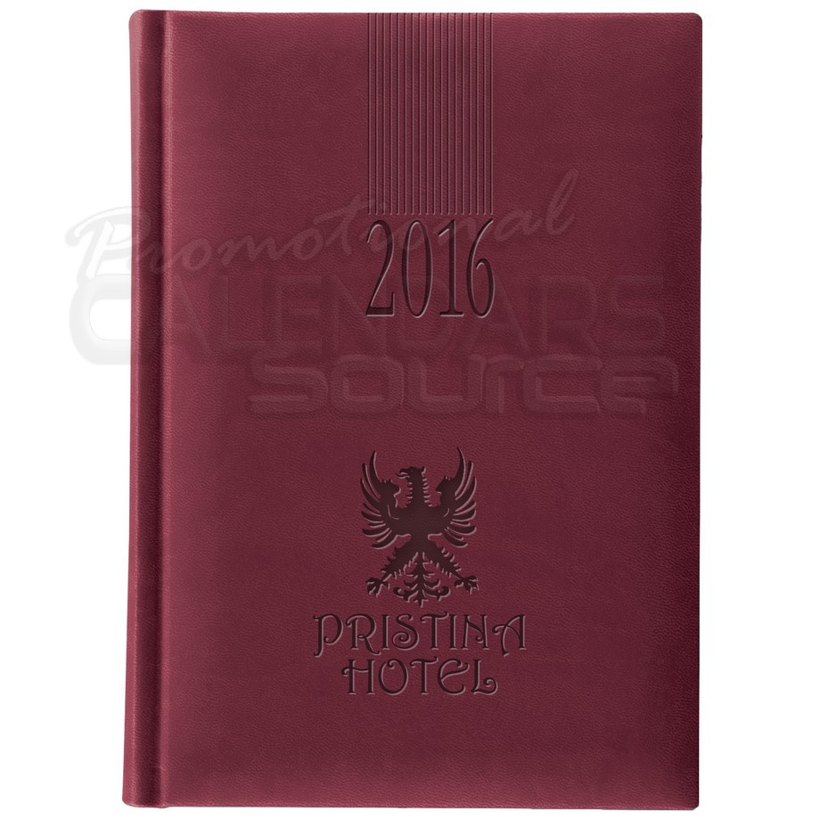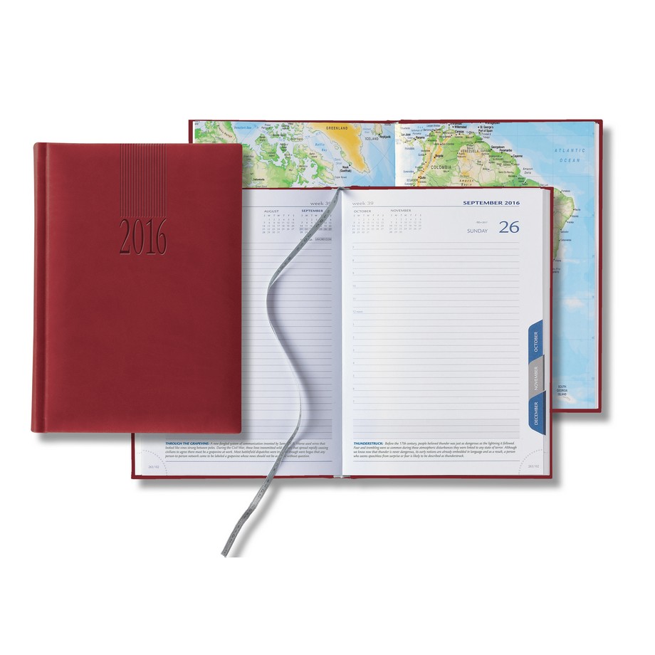 The Castelli Tabbed Mid Size Daily Includes: 416 white lined pages with time reference in modern blue and gray print. A tab separates each month where each page includes perforated corners, a month at a glance in three month sections. A silver ribbon marker with printed year date and an extensive reference section in the back that includes National and International Holidays, maps, exchange tables, and important reference lists. Our most popular cover, Tucson is a smooth soft texture that is often mistaken for leather.