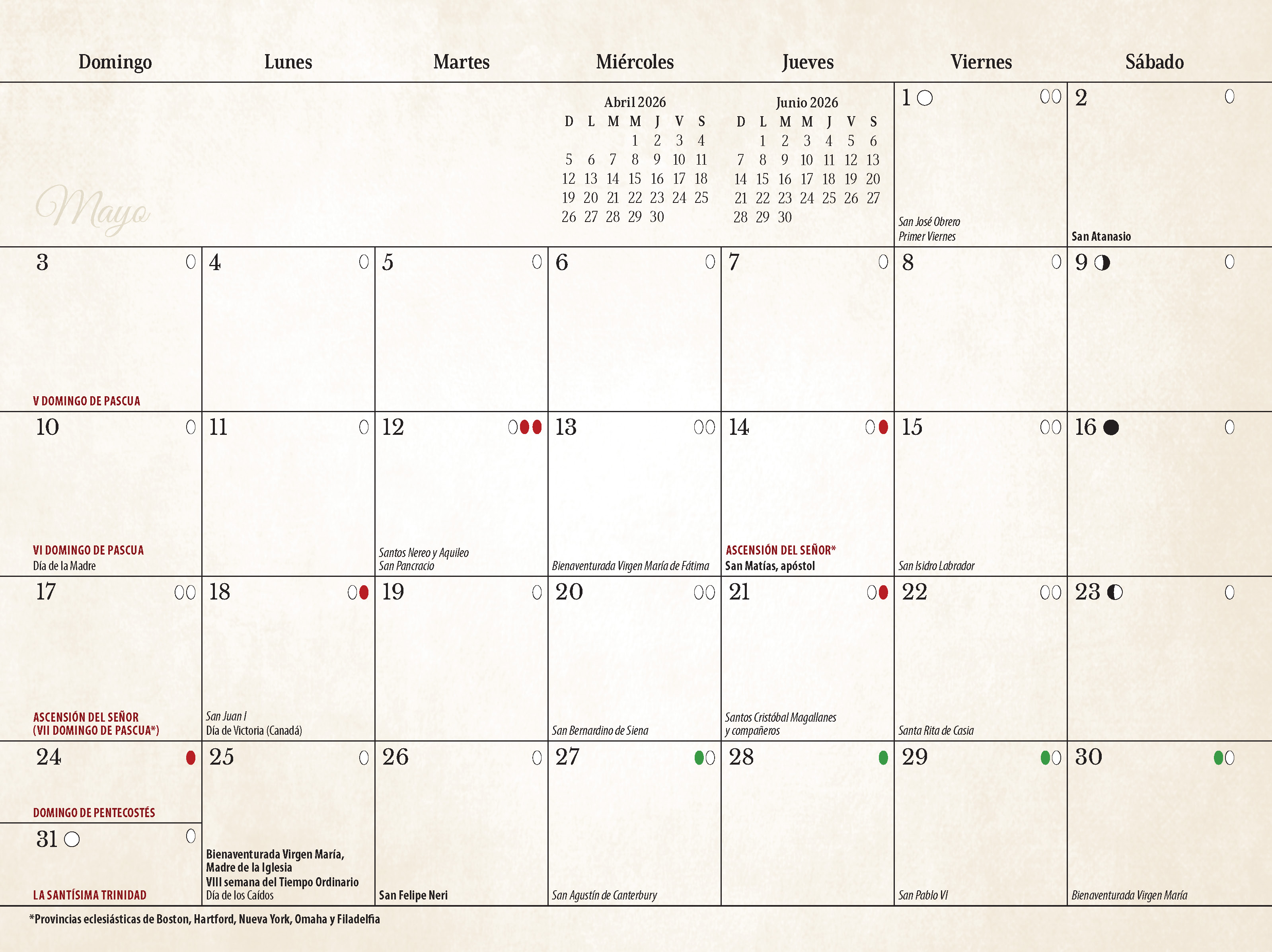 Catholic Art Calendar in Spanish Espanol, tells the story of God’s saving relationship with us through stunningly beautiful images. The 2027 version of this perennial best seller draws people into a deeper relationship with Christ by presenting key moments of His life in monthly images that arouse both wonder and worship. If a picture is worth a thousand words, each monthly image of this calendar proclaims a thousand Catholic teachings. This calendar is, thus, a feast for the eyes and a teaching for the soul. Color-Coded Vestments are printed on the monthly grids. This calendar may be referenced time and again for inspiration and quiet contemplation.