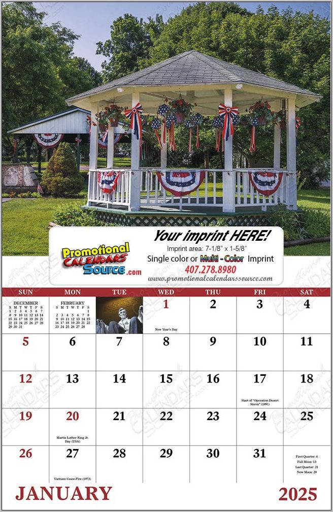 This Patriotic themed calendar "Celebrate America" is the perfect gift with your business custom imprint in the Window cutout area . Filled with patriotic images showcases the USA spirit and love for country. Custom printed with your business information in single or multiple color options, will be a delight for your recepients.