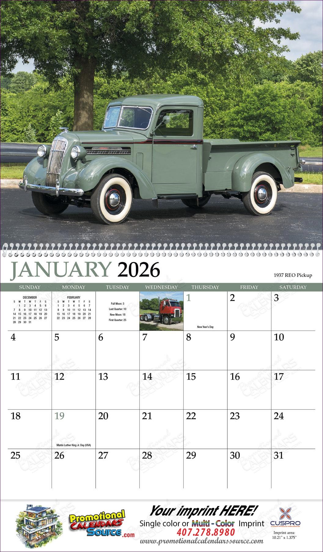 Classic Trucks Promotional Calendar - Spiral. Feast your eyes on these fabulous haulers from the good old days. Whether a collector or truck enthusiast, you?ll definitely want to get behind the wheel of all thirteen classics featured in this calendar. Spiral Bound calendar. Custom printed with your information will provide year long advertising.