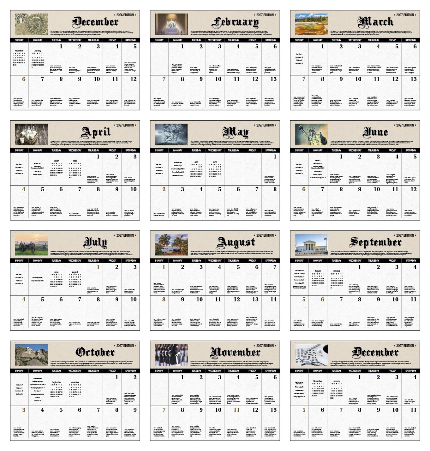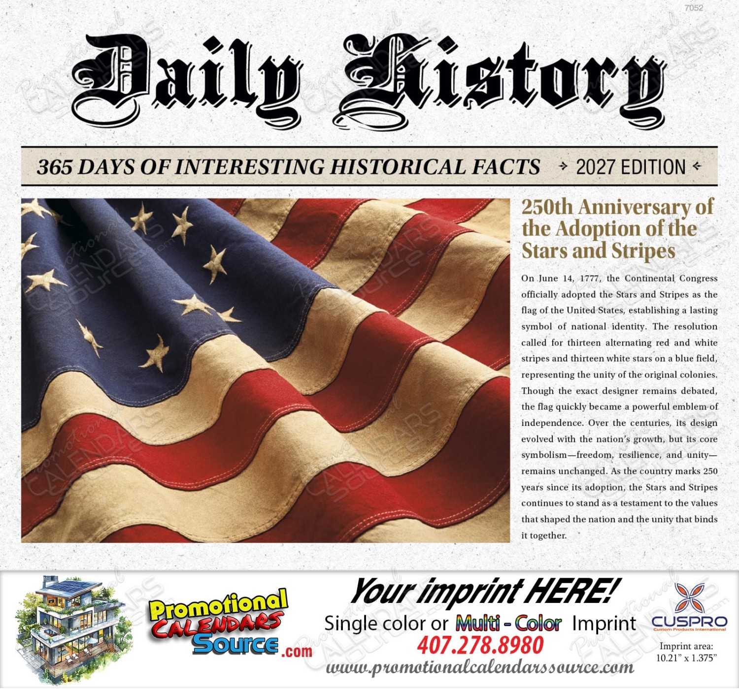 Daily American History Facts Calendar with Stapled binding for a perfect fit. This calendar displays on each date block, facts of American History. Perfect for advertising your business & services and for an artful and cultural connection to your audience.