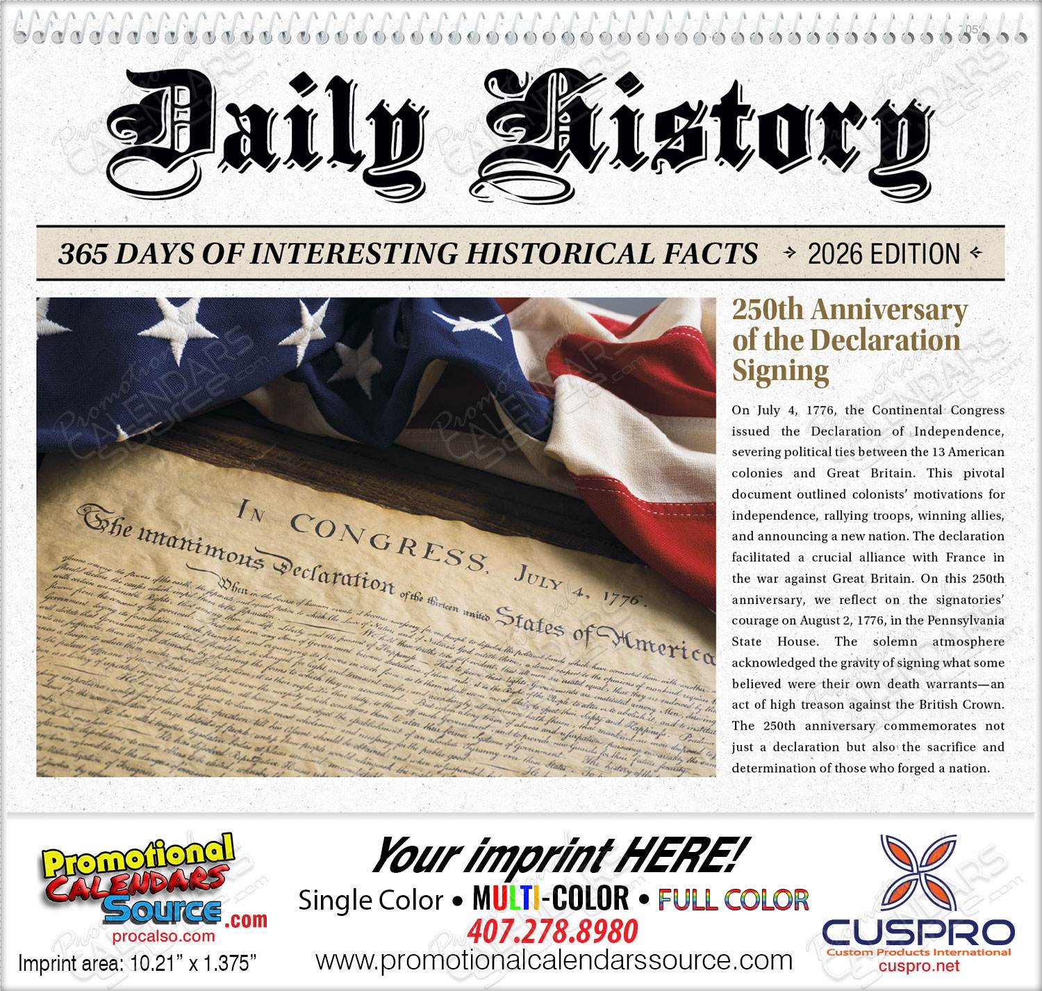 Daily American History Facts Calendar with Spiral binding for a perfect fit. This calendar displays on each date block, facts of American History. Perfect for advertising your business & services and for an artful and cultural connection to your audience.