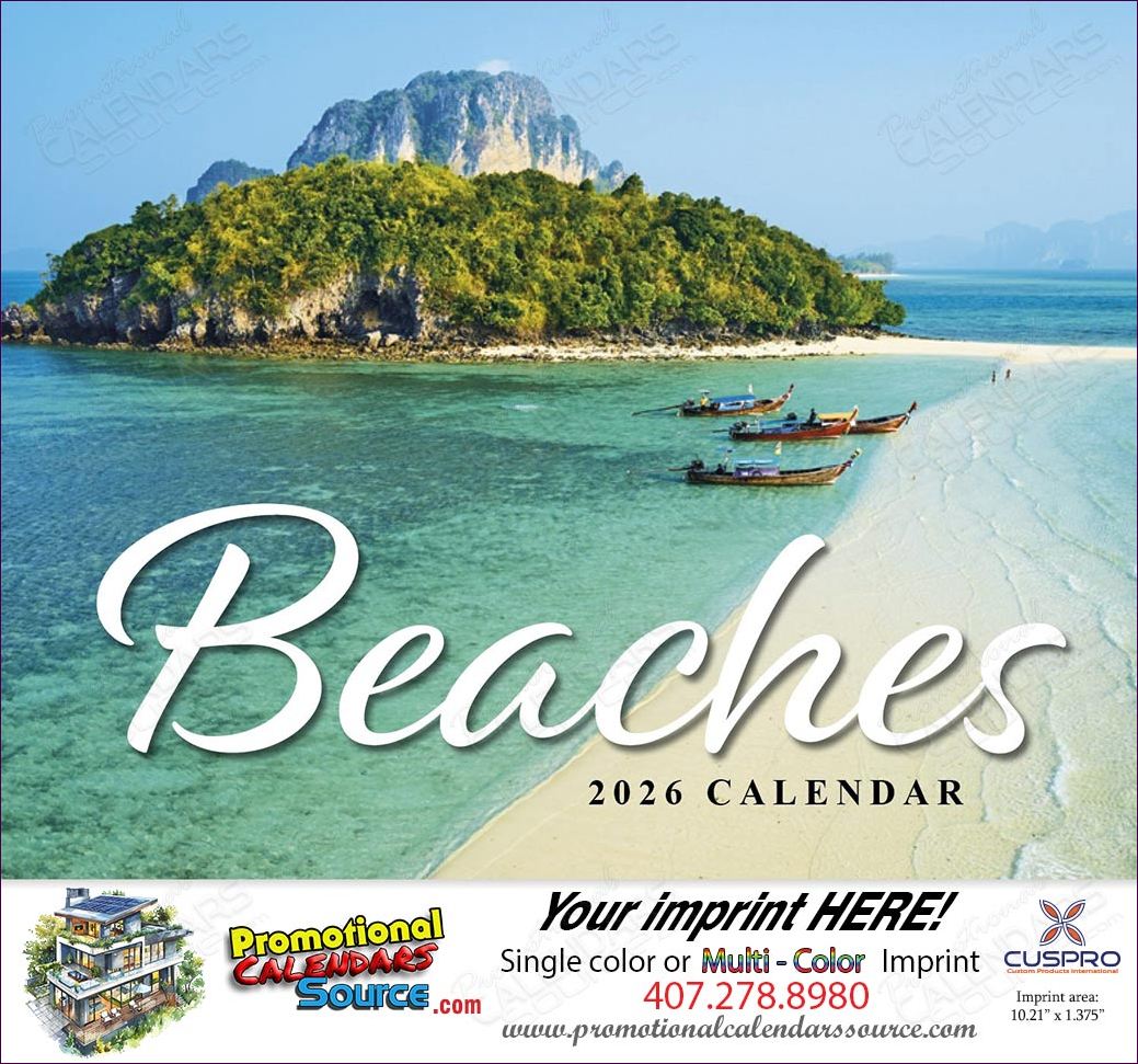 Fabulous Beaches Wall Calendar with Staple binding. Personalized with your custom imprint. Escape to these sunny exotic beaches and relax. Escape to lands of natural beauty with this display of ocean side scenic views. Features thirteen breathtaking images of picturesque vistas of beaches from across this great world. Custom printed with your information will provide year long advertising.