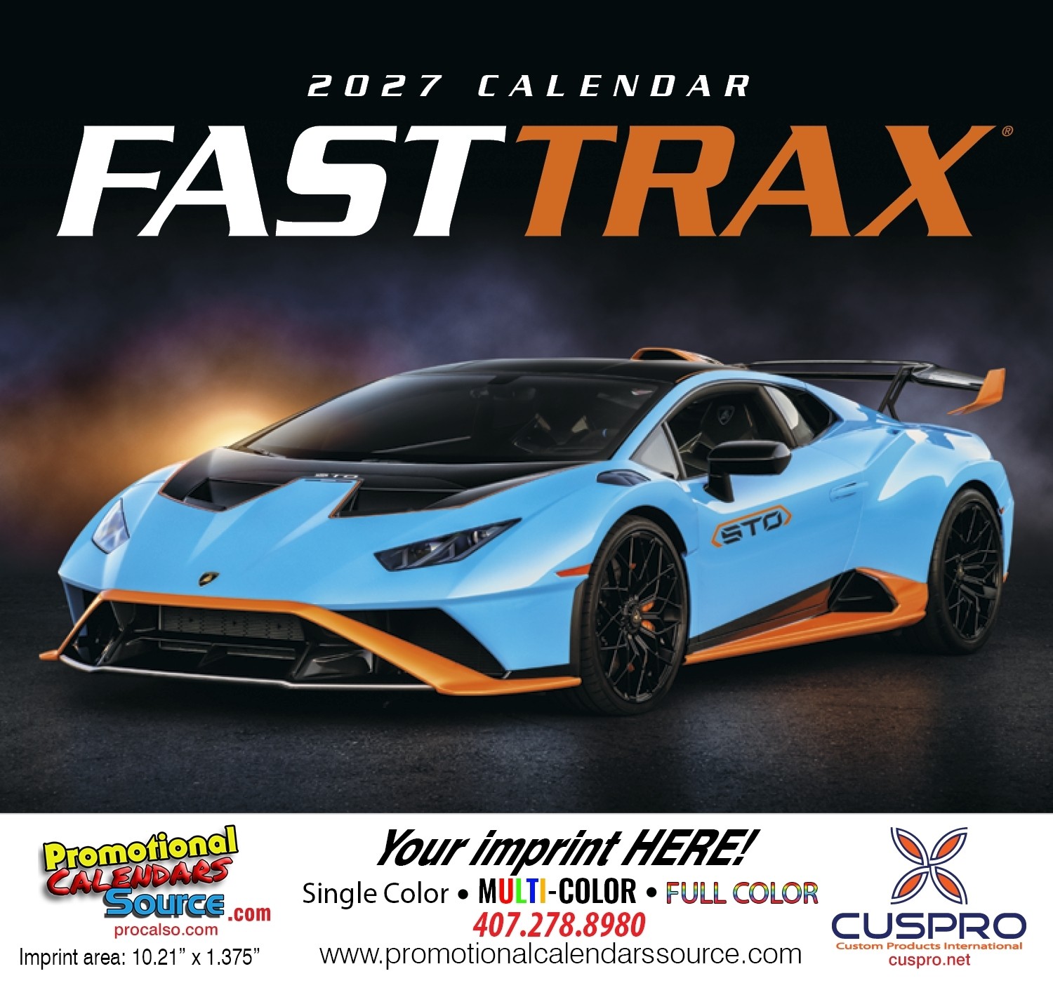 Fast Trax Promotional Calendar Stapled. Keep your focus on these sizzling cars but be quick, because they ll be gone in a blink of the eye. This calendar features thirteen of the fastest and hottest cars you ll find anywhere. Custom printed with your information will provide year long advertising.