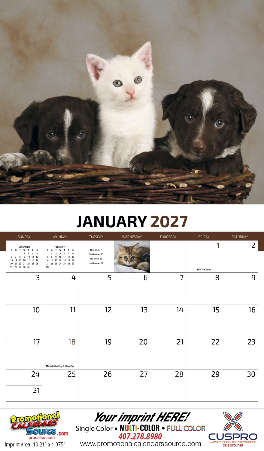 Four Paws Promotional Calendar - Stapled. Warm your heart all year long with these cuddly and playful puppies and kittens. Loved by kids and adults alike, this thirteen-month canine and feline fest will add furry fun to the entire year. Custom printed with your information will provide year long advertising.