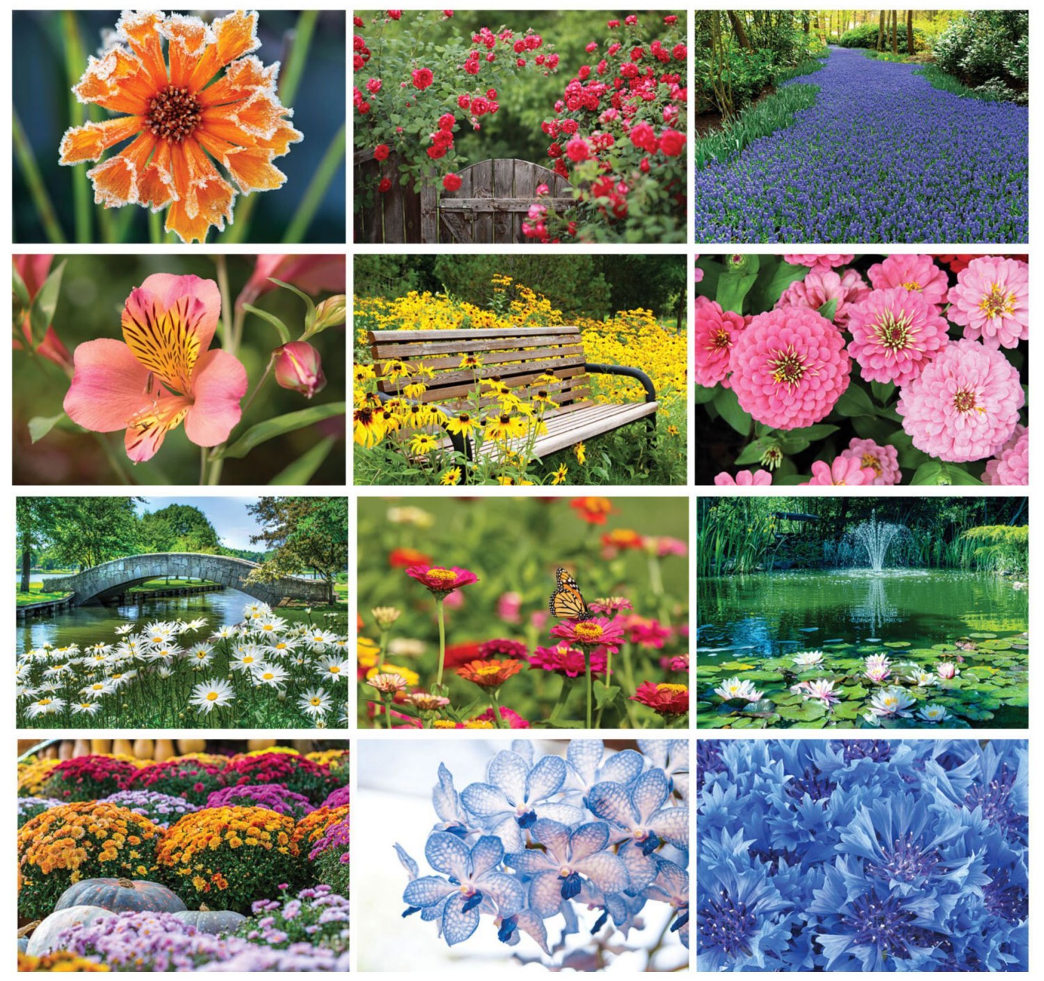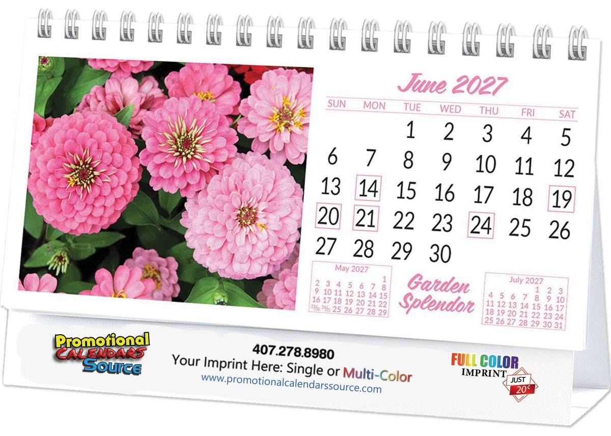 Garden Splendor Promotional Desk Calendar . Stand-alone spiral desk calendar with monthly image on each side. 12 pages with high quality photos of gardens and flowers.
