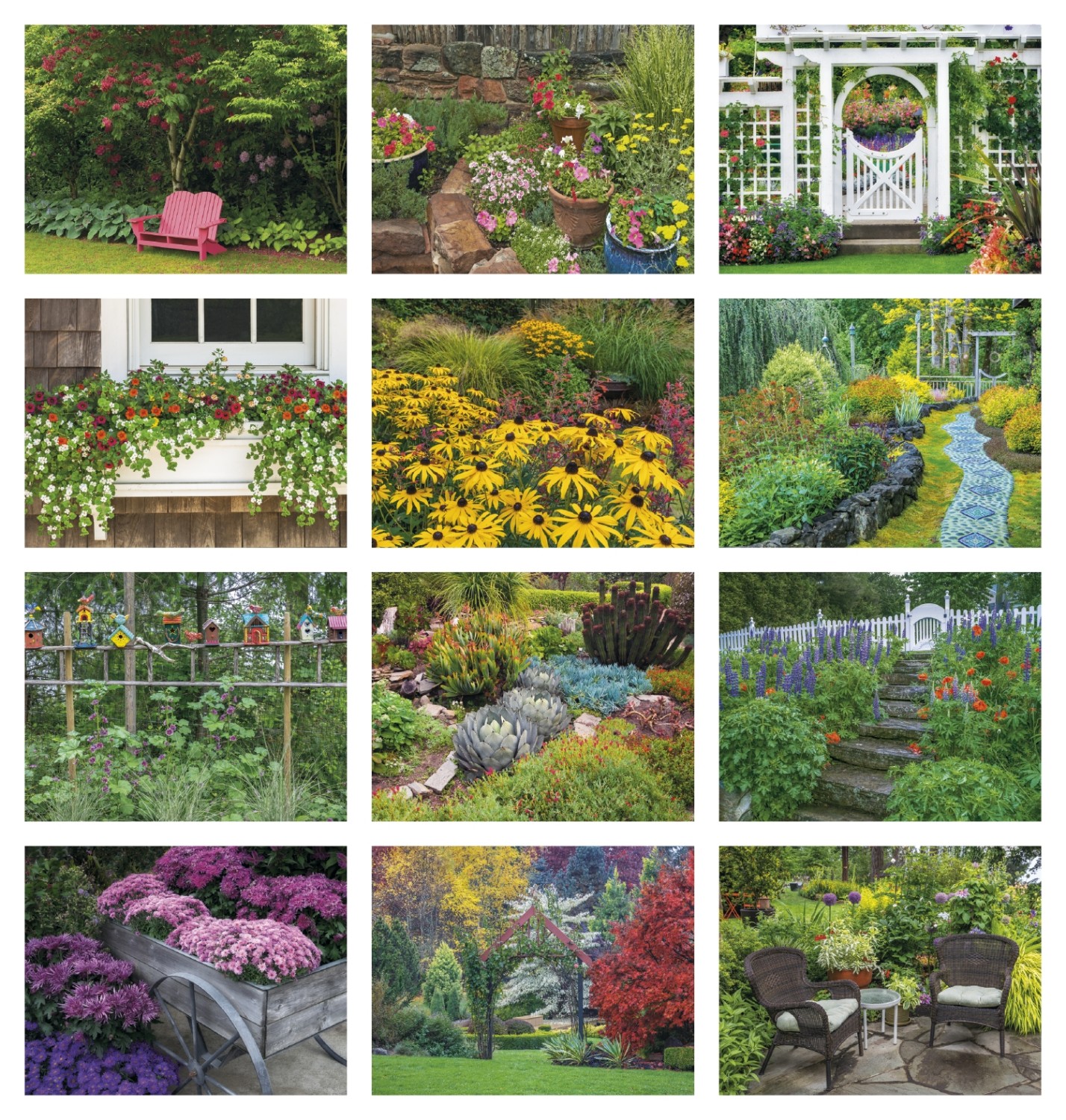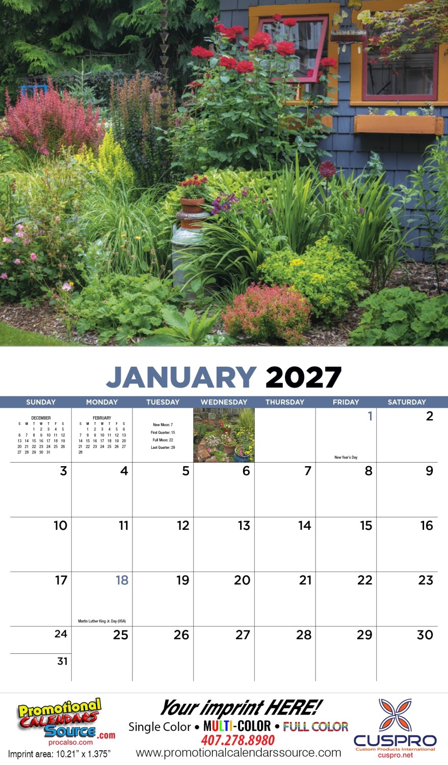 Gardens Promotional Calendar Stapled. No matter where you live, you can enjoy soothing views of beautiful gardens all year long. This gorgeous calendar features lavish gardens with brilliant blooms to lush backyard retreats. Custom printed with your information will provide year long advertising.