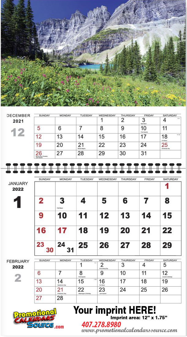 This Great America 3 Mont View Promotional Calendar is a 3 Mont View promotional calendar with images of great scenic America landscapes. Customized with your business information for lasting impression diplayed for quick reference.