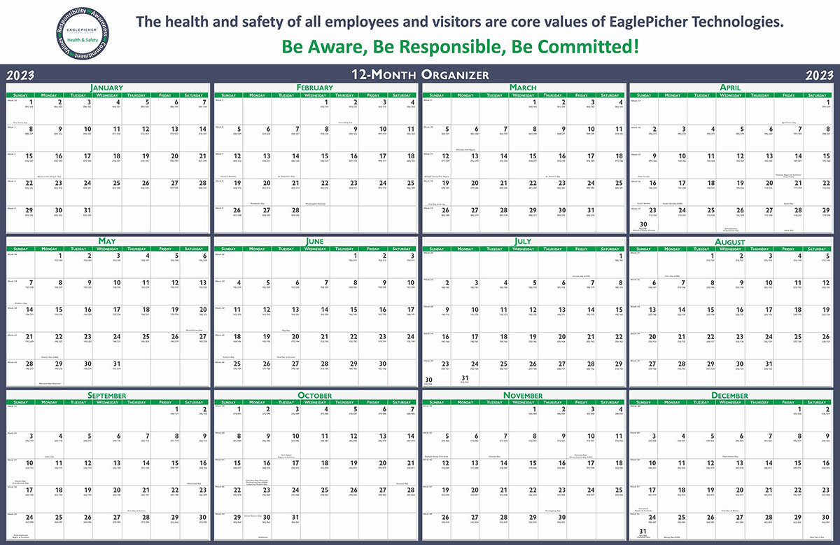 This Horizontal layout Year-In-View calendar with plastic lamination is an effective tool for keeping enent details recorded and visible for all to see throughout the year. It is a Must-Have for offices, factories and organizations. The calendar features 3 mil. lamination on both sides perfect for dry erase markers. Two Hanging Tabs included with order. Pens and Extra Hanging Tabs available at additional cost. Calendar is printed on recycled 100% post-consumer paper.