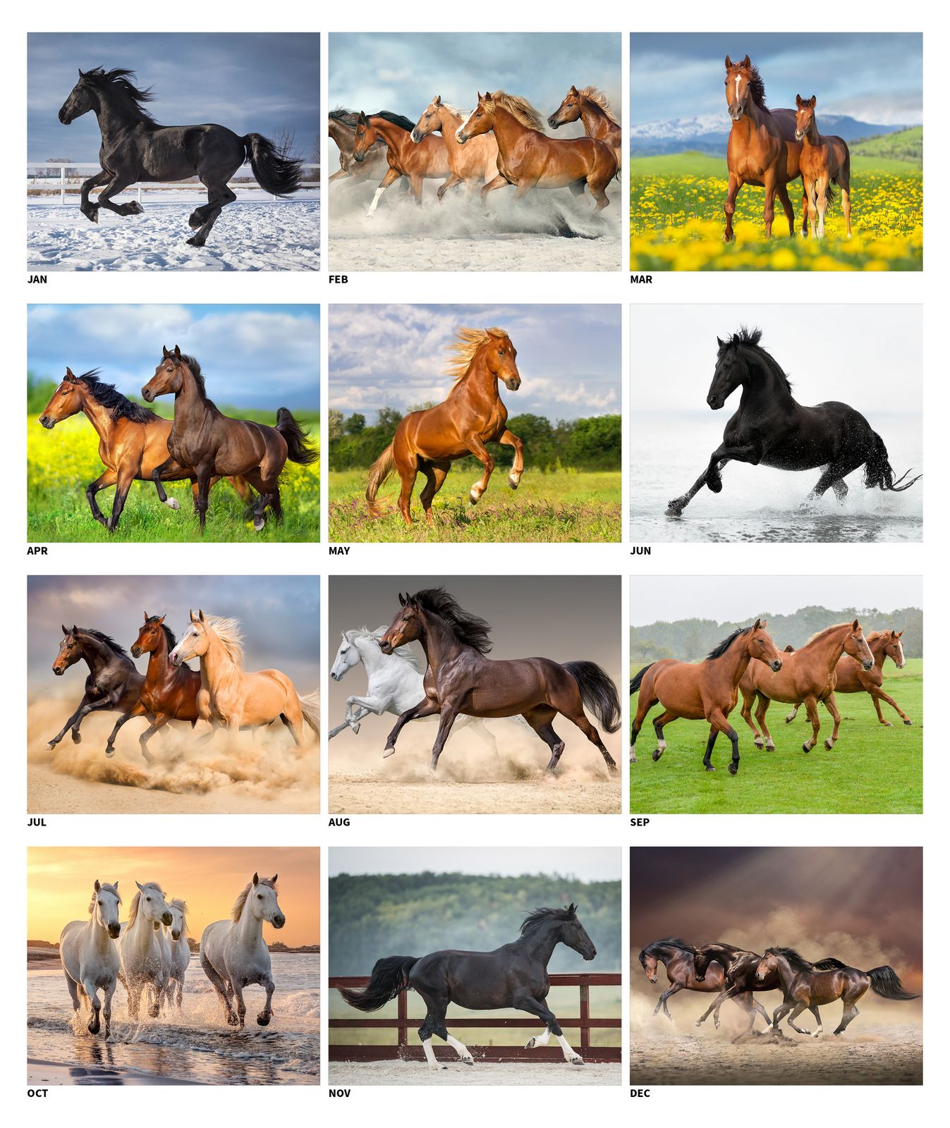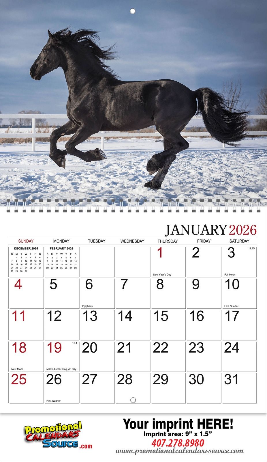 2023 Horses Wall Calendar w Spiral Binding, a colorful Promotional Calendar custom printed for your year long advertising. Filled with images of horses, attractive imagery to be enjoyed all year long displaying your message and business information.