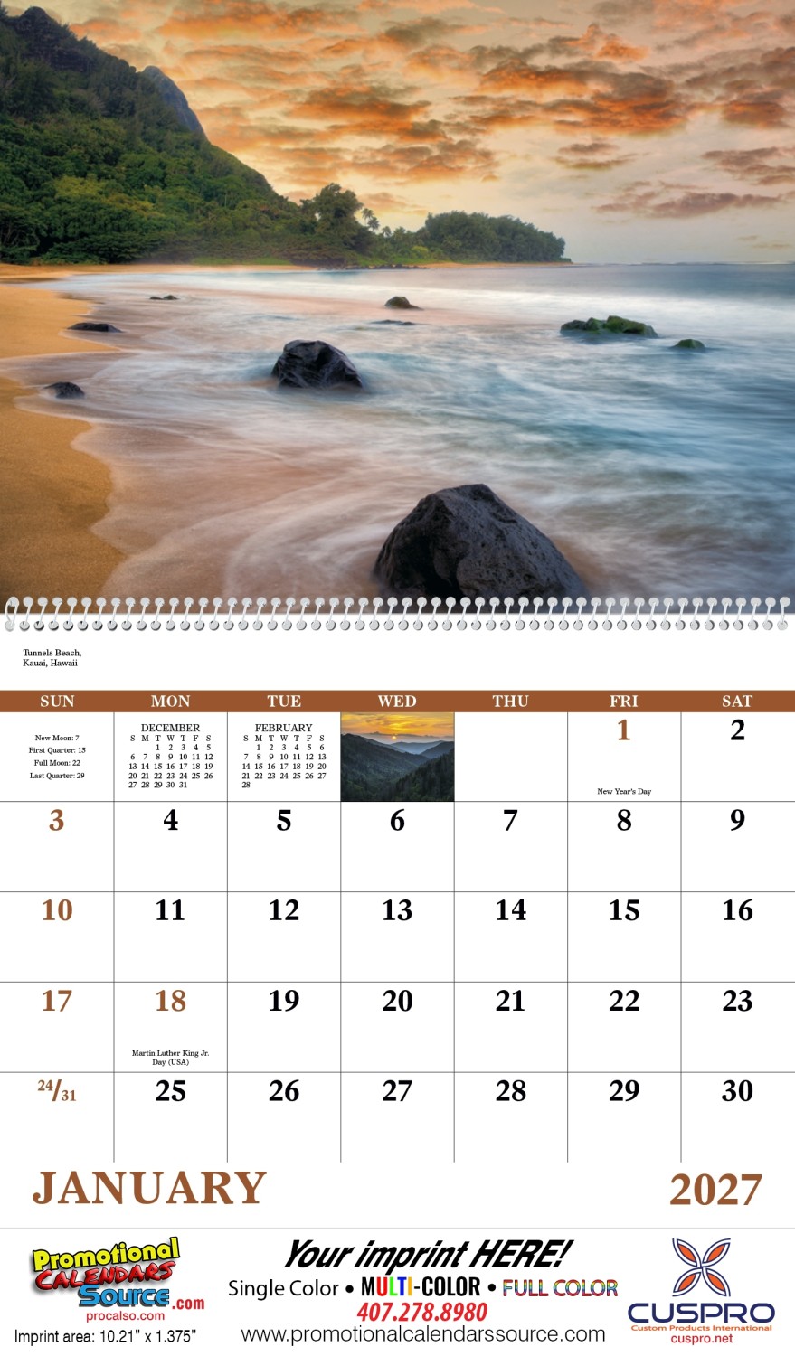 Order your Landscapes of America Promotional Wall Calendar today and elevate your business marketing strategy with beautiful, functional branding!