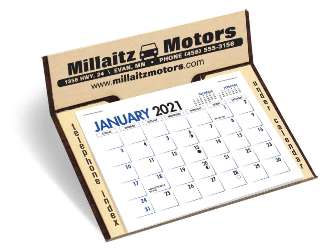 Memo Promotional Easel Desk Calendar. This Memo desk calendar offers convenient size and an advertising message that is boldly displayed at the top of the calendar. It offers outstanding value and ad visibility. Available mount colors: White-Red, Tan-Woodgrain. Contact us with your design needs so we can assist you finalize the details of your calendar.