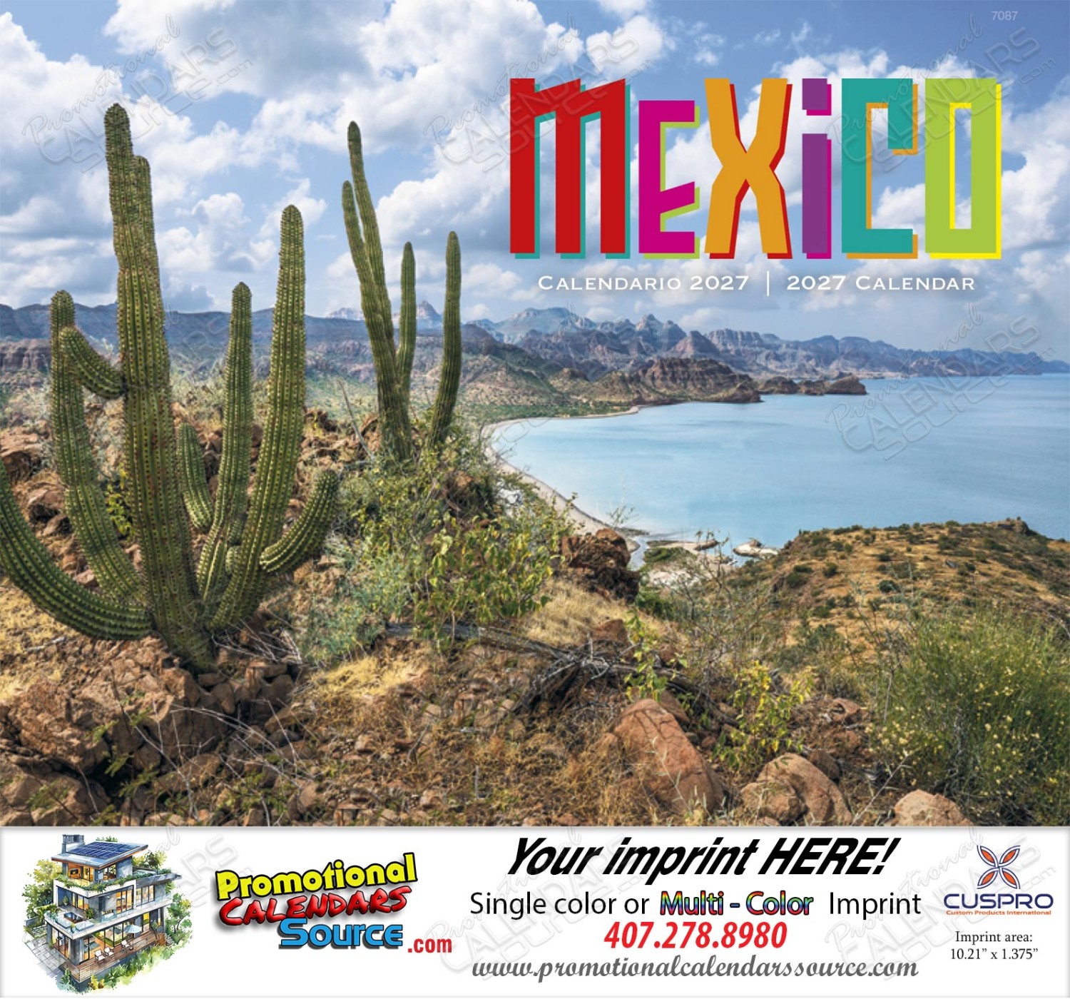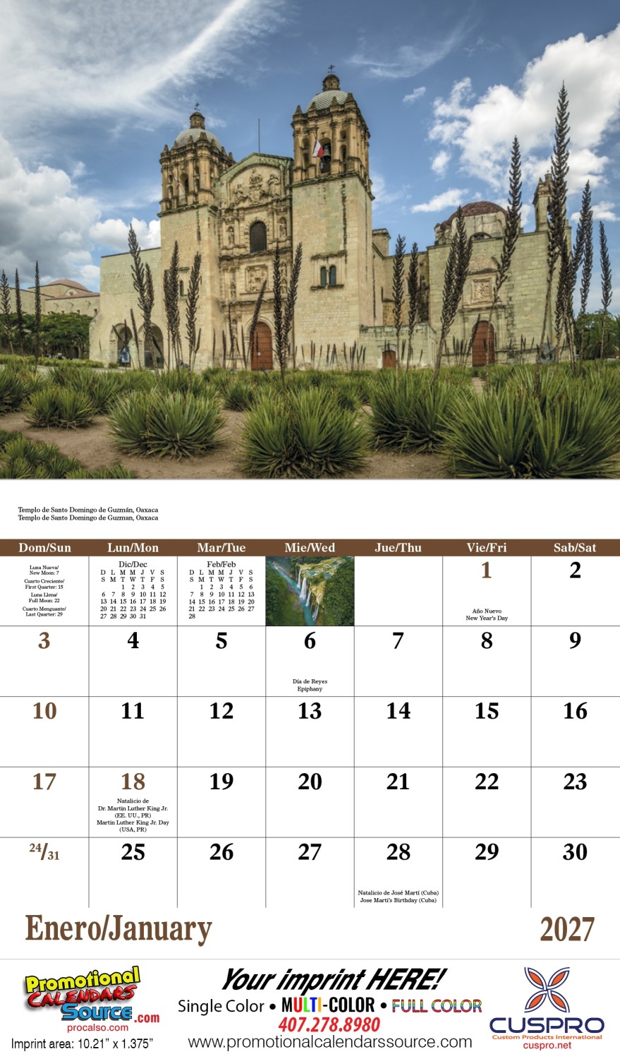 Advertise and promote your business with this calendar filled with images of landscapes and colors of Mexico. Reach your Latino audience with this bilingual Spanish/English grid.