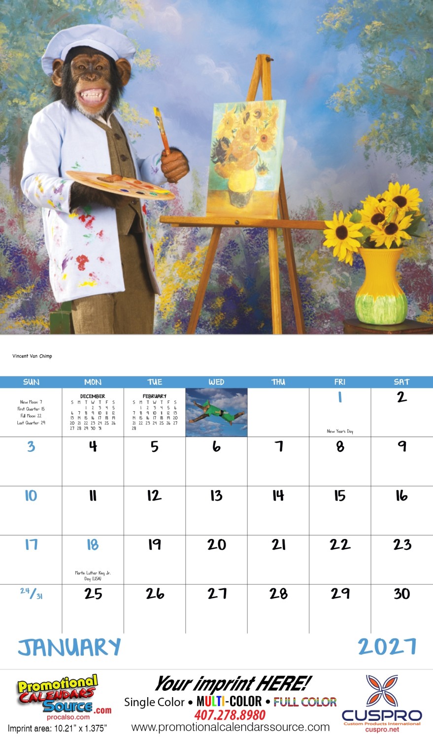 Monkey Mischief Promotional Calendar Stapled. 13 Monthly images of Funny monkeys make customers laugh. 11x19 size open with a drop ad copy to customize with your business information.
