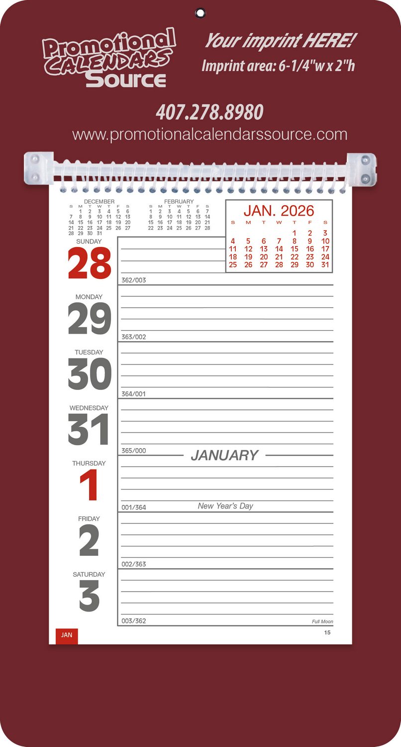 Promotional Big Numbers Weekly Memo Calendar - Maroon. This handy model has a sturdy mount board with a hanging hole, features large, bold numbers along with ruled daily memo space. View a full week with insets of before, current and after months on every page. Optional easel back available. Maroon color mount.