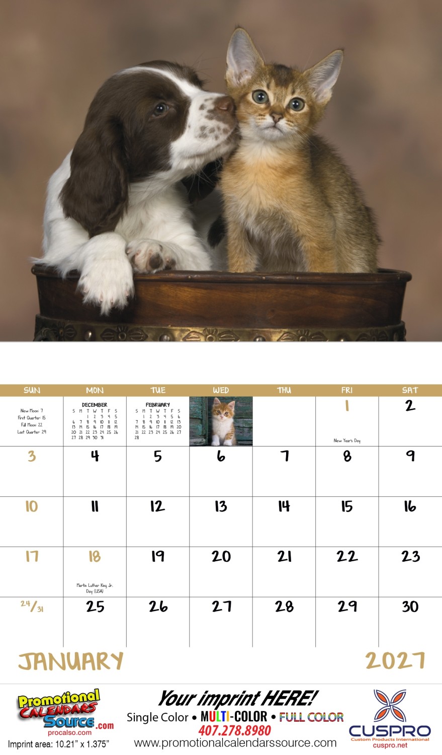Puppies & Kittens Promotional Calendar Stapled. Wall Calendar to promote your business. Filled with images of Puppies & Kittens is perfect for Pet lovers of all ages. Dogs, Cats. 13 months dispayed with big blocks for notes and appointments. These adorable images will truly connect with your customers.