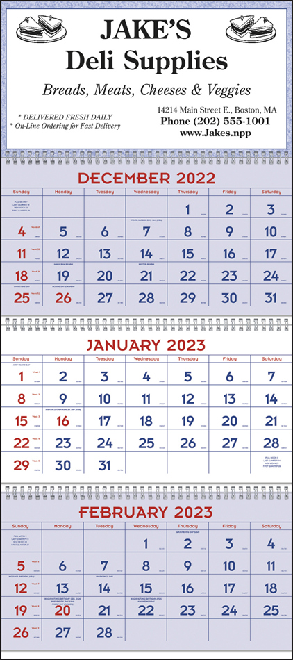 Style 6603 uses 186 Red and 286 Blue - All imprint colors are out of 4-color process - All 3-grids include Julian dates - 2026 Promotional Custom Printed Calendar
