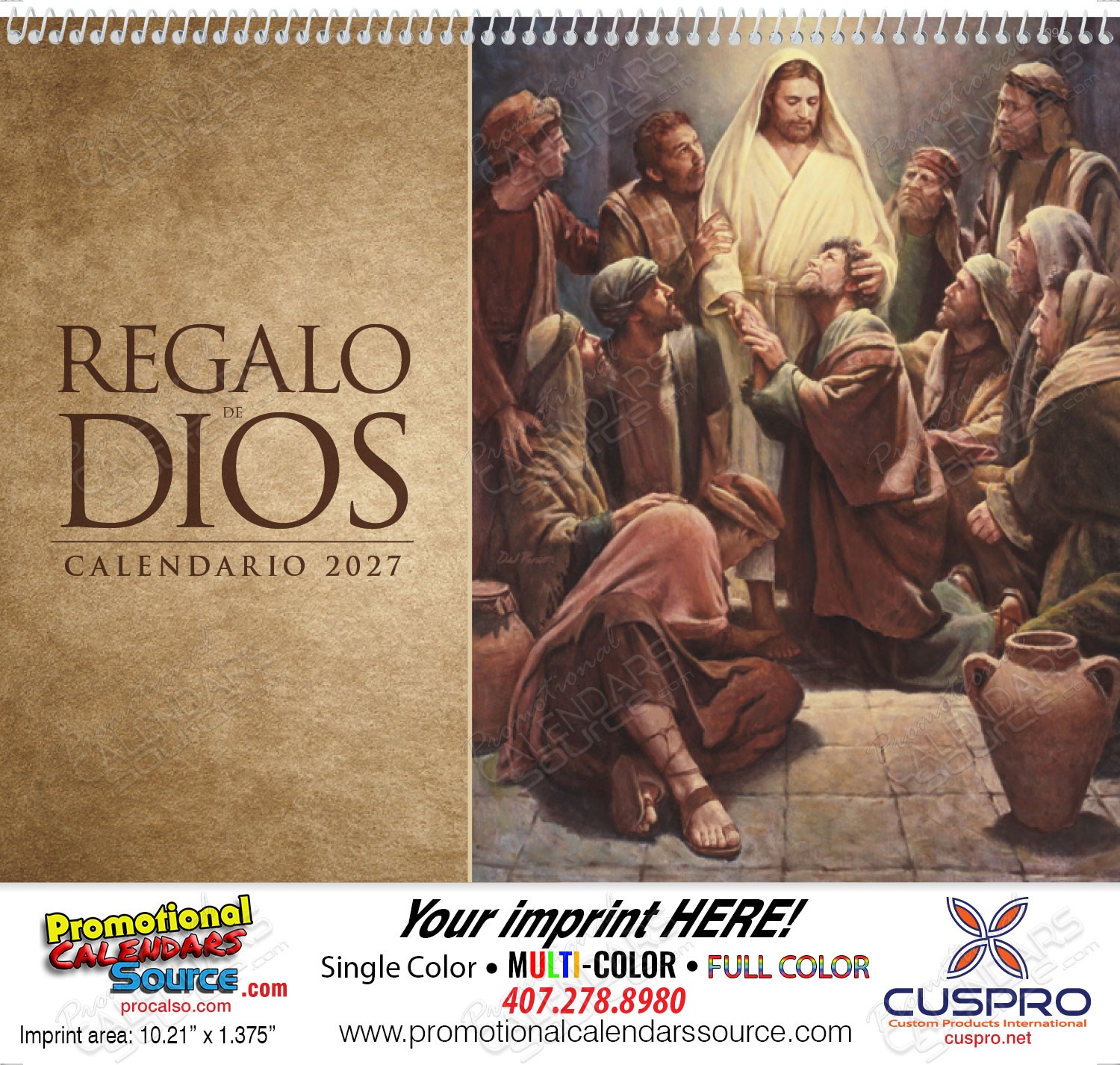 Regalo de Dios wo Funeral Pre-Planning Form Promotional Calendar Spanish. Great for advertisers with Spanish speaking customers. The grid includes Catholic observances.