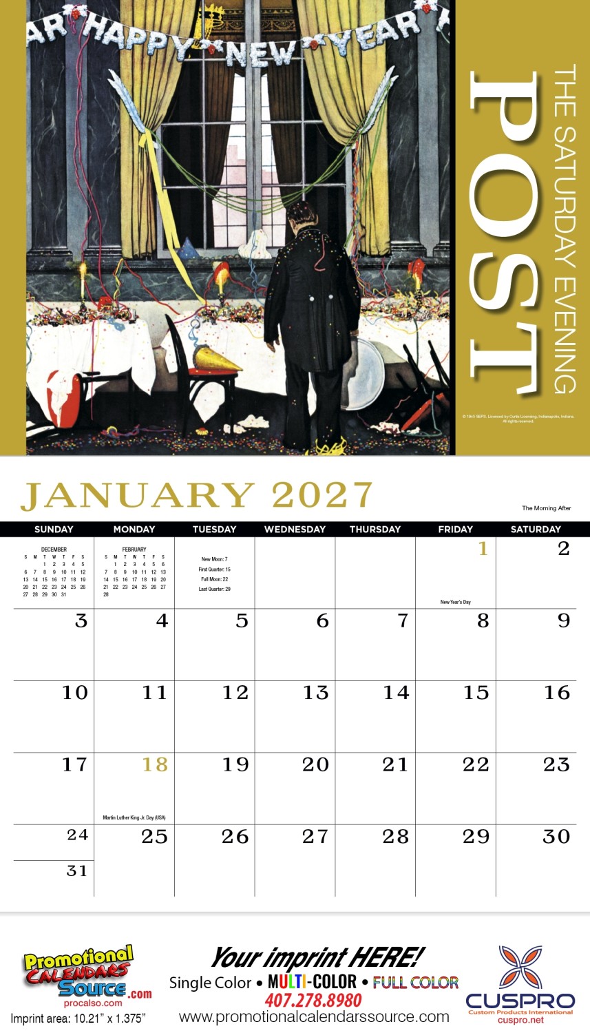 Saturday Evening Post Promotional Calendar Stapled. Remember a simpler time with this nostalgic collection of thirteen Norman Rockwell illustrations from the covers of the beloved Saturday Evening Post magazine. Custom printed with your information will provide year long advertising.