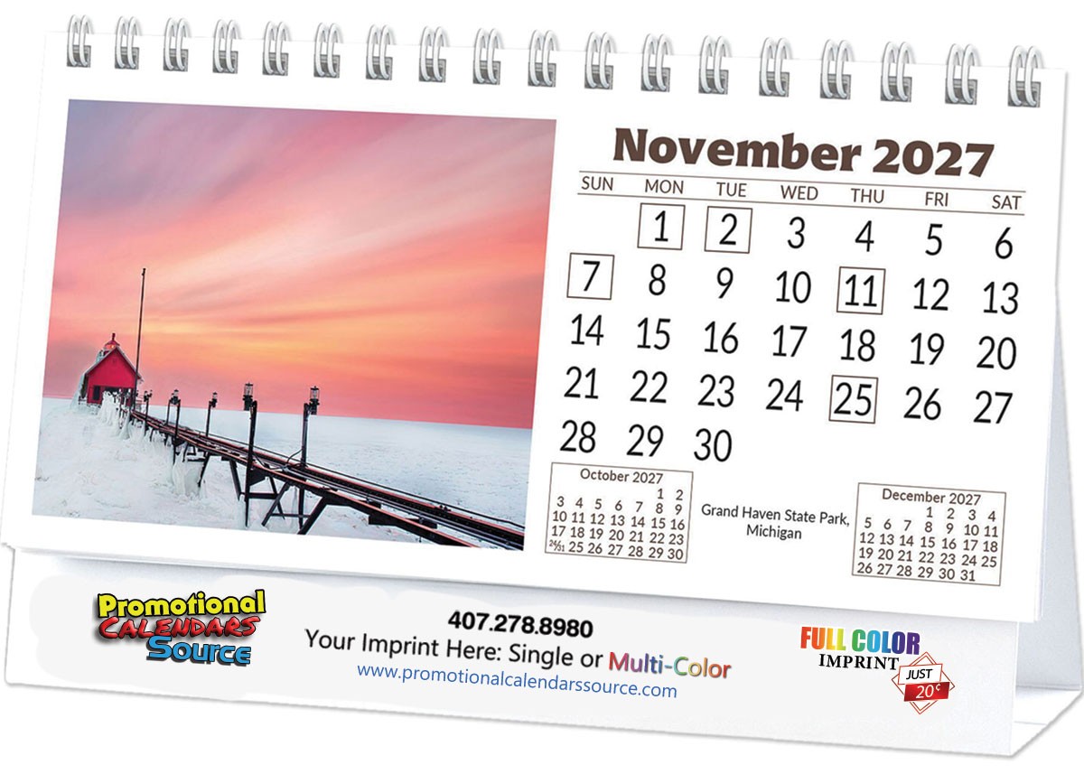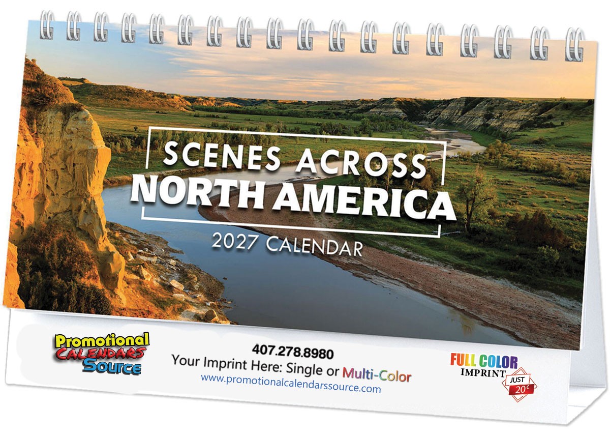 Scenes Across America Desk Promotional Calendar. Scenic Stand-alone spiral desk tent calendar with monthly image on each side. 6 Sheets - 12 pages with high quality photos of American scenery.