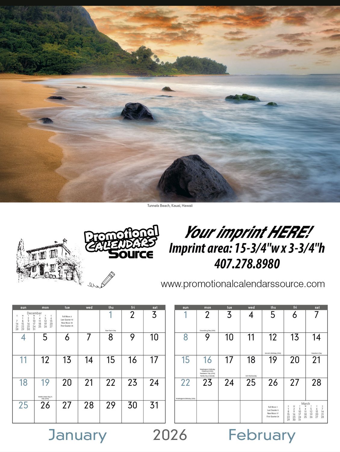 Large format calendar with plenty of room for your advertising copy. Your ad copy printed in up to 4 colors or four color process. Large imprint area for your business advertising copy printed simply in Black or any other color. Multi-color and Full-Color imprint is available at additinal cost. Let PromotionalCalendarsSource.com assist you to make this calendar your year long billboard. Contact us with your design needs so we can assist you finalize the details of your calendar.