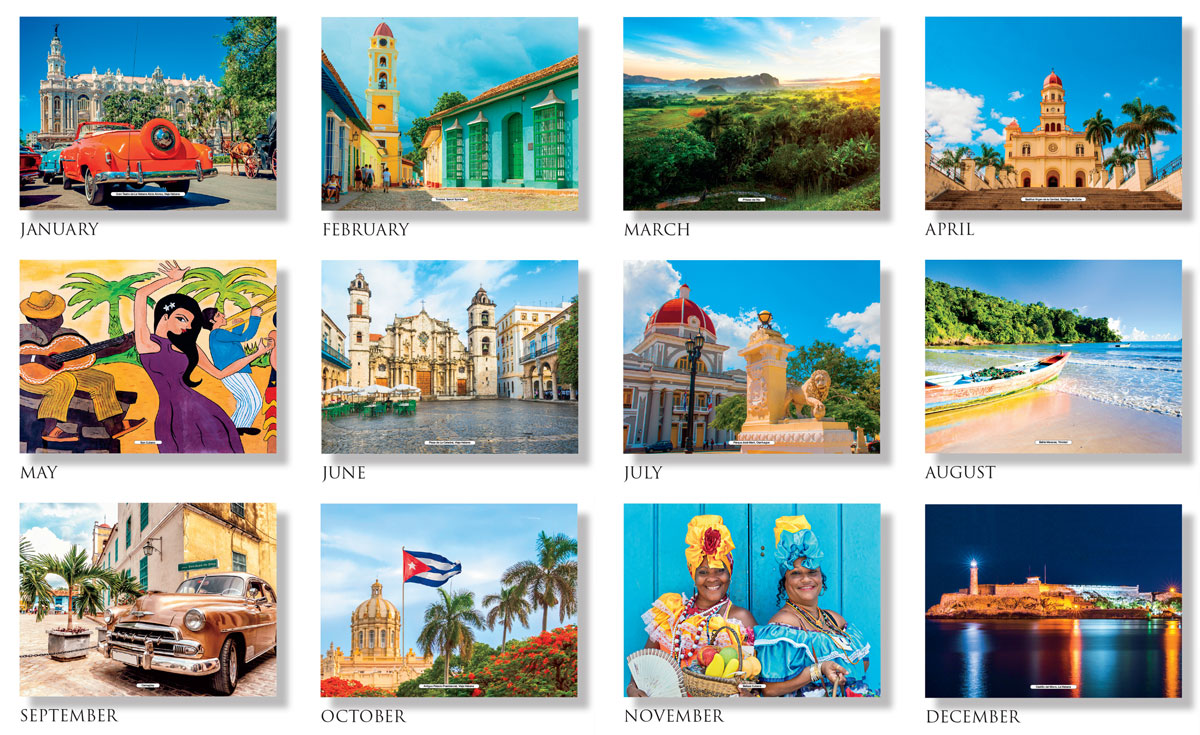 Let this calendar take your customers on a tour of Cuba and its enchanting secrets and Welcome back to this hidden treasure. Travel to La Habana, Cienfuegos, Camaguey, Matanzas, Pinar Del Rio, with this scenic calendar of Cuba.