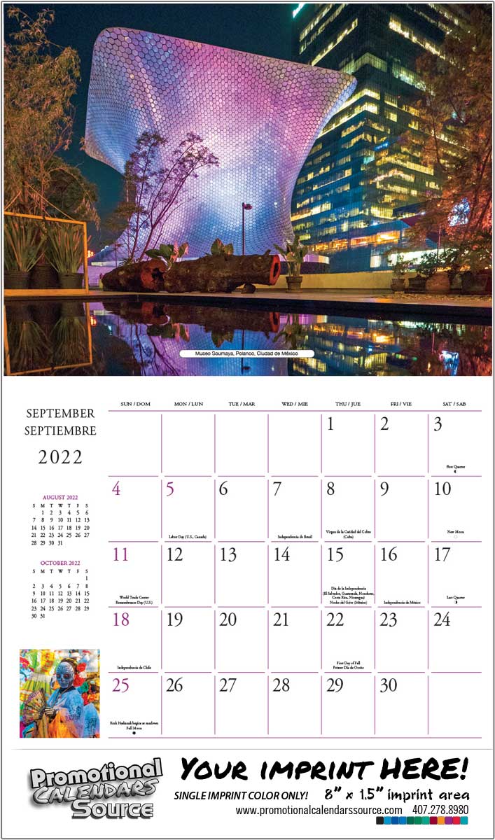 Latino Scenic Calendar, Bilingual Spanish-English Wall Calendar, 12 month Calendar, Single color imprint for ad copy