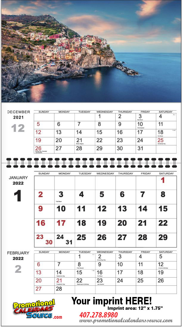 Scenic 3 month view calendar to be custom printed with your advertising copy.