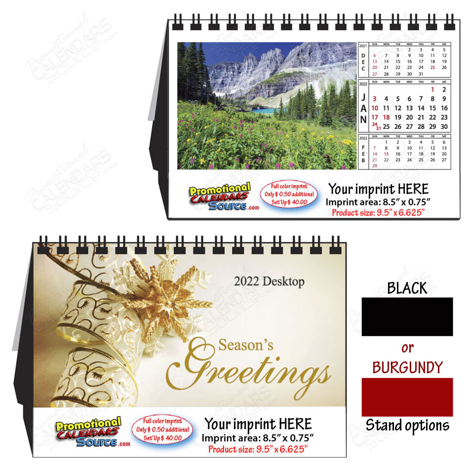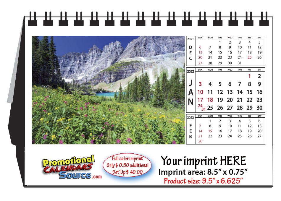Our Item JC-902 is a large desk tent style calendar with dimensions of 9.5"x6-5/8". Pages are 8 pt. cover stock and the support is a sturdy 70 mill. Linen Finish stock. It is decorated with scenic images of US landscapes with a 3 month calendar on the front, and a large memo appointment style grid on the back. This is a great promotional calendar to keep your advertising on a desktop all year and as a quick reference for recepients.
