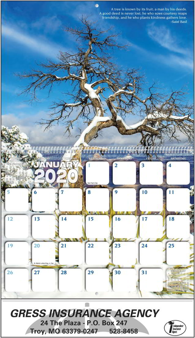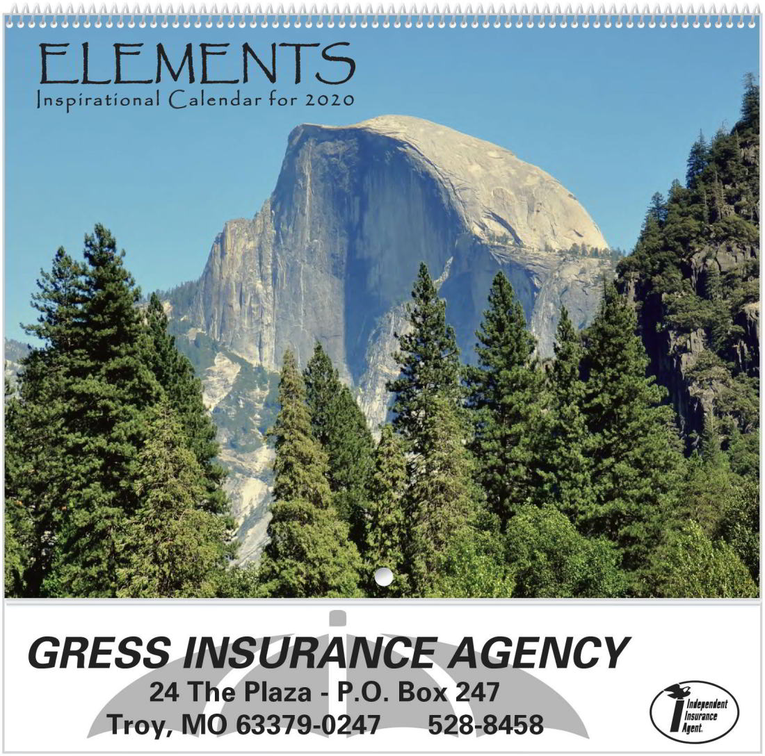 An scenic inspirational calendar with an appreciation for the wonders of the world we live in and the lives we lead. Vivid natural, yet colorful, views and vistas become the eye candy that will insure display of your message. Elements is the perfect calendar for advertisers looking for a contemporary, upscale audience. The indicated size represents the open calendar measurements, 10 7/8" x 10 1/2" closed. 10 7/8" W x 19" H.