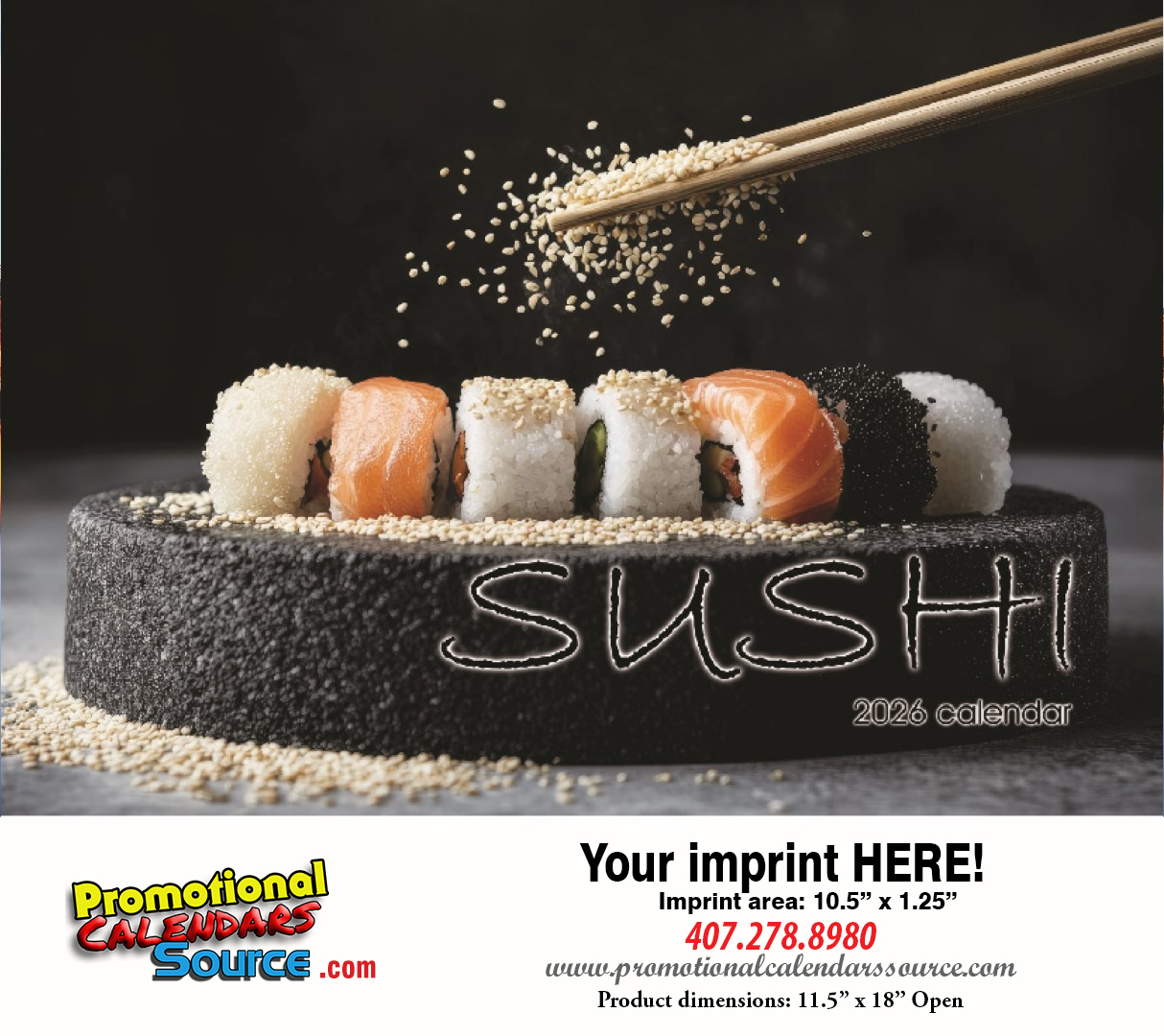 Sushi Oriental Cuisine Calendar 2023, size 11.5x18 with Staple Binding. For lovers of Sushi and Oriental Cuisine is a perfect advertising product. Colorful refreshing images decorate this appointment wall calendar, a 12 month calendar of great quality. The attractive and different desing, will certainly attract attention and be admired all year long, promoting your advertising message. Custom printed with your business information and logo for a year long exposure will be a great and appreciated gift.