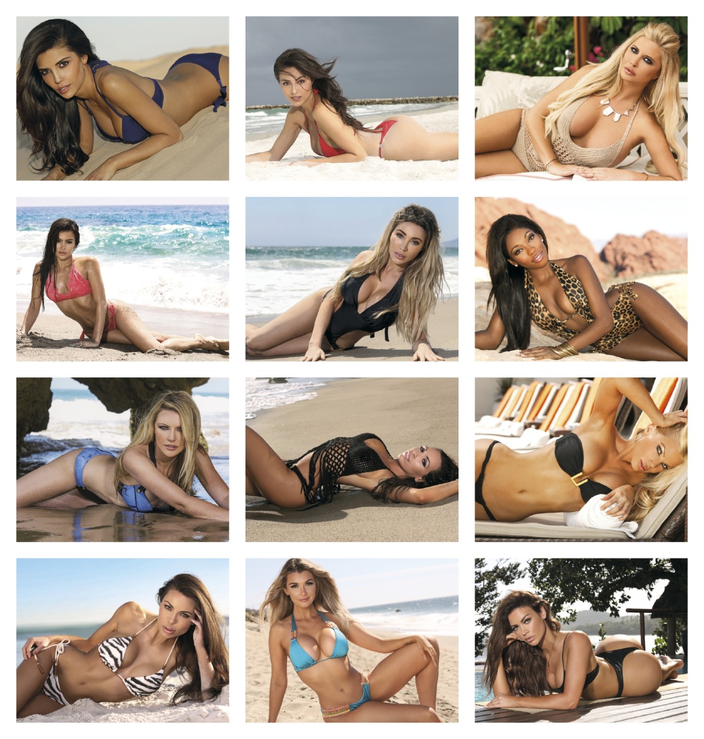 Beautiful swimsuit models boost appeal for the entire year. 13 month wall calendar for to promote your business all year round. Aan attractive calendar to captivate your audience. 11x19 inches open size and generous back drop for your advertising message.