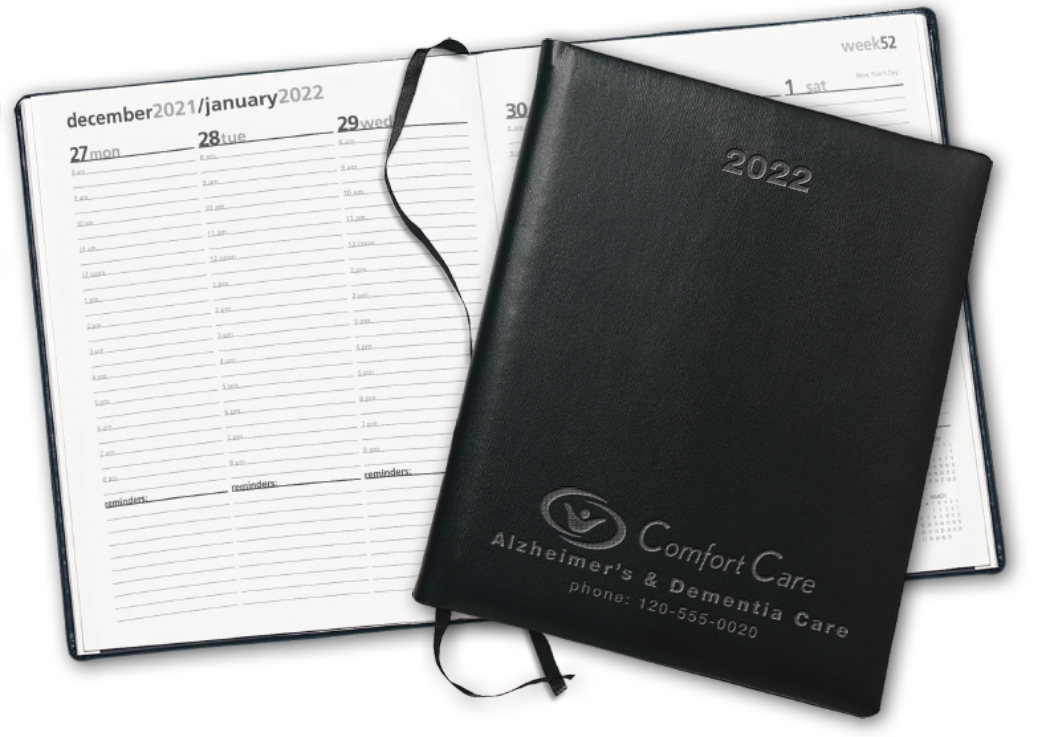 Weekly Desk Planner Symphony with debossed custom imprint. Soft, matte cover material is embossed for a subtle, elegant and contemporary look. The large desk format provides ample room for recording all your important meetings, appointments and other scheduling details. Gold corners and bookmark ribbon.