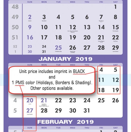 3-Month Custom Executive Calendar w Drop Ad is a 14 Sheets, 3-month View, Wire-O Bound, Direct-on Picture Top with Tear-off Pad, Full-color printing on both side of picture top sheet, Two-color printing on one side of pad (Black + PMS) and Black imprint on the Drop Ad. Ad must remain the same for the entire order, Copy changes are available with extra charges.