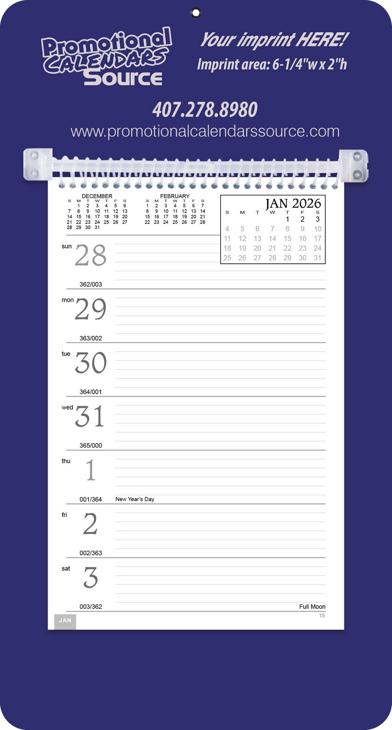 Promotional Weekly Memo Calendar - Blue. This handy model has a sturdy mount board with a hanging hole, along with ruled daily memo space. View a full week with insets of before, current and after months on every page. Optional easel back available. Blue color mount.