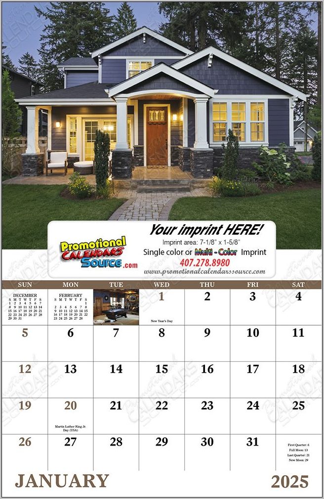The "Welcome Home" Calendar has a Window cutout in the middle of it, where your imprint will be displayed. Decorated with images of Gorgeous homes, will keep your promotional message close at hand. Your ad will be printed in a cut-out window in the center of the calendar to guarantee exposure all year.