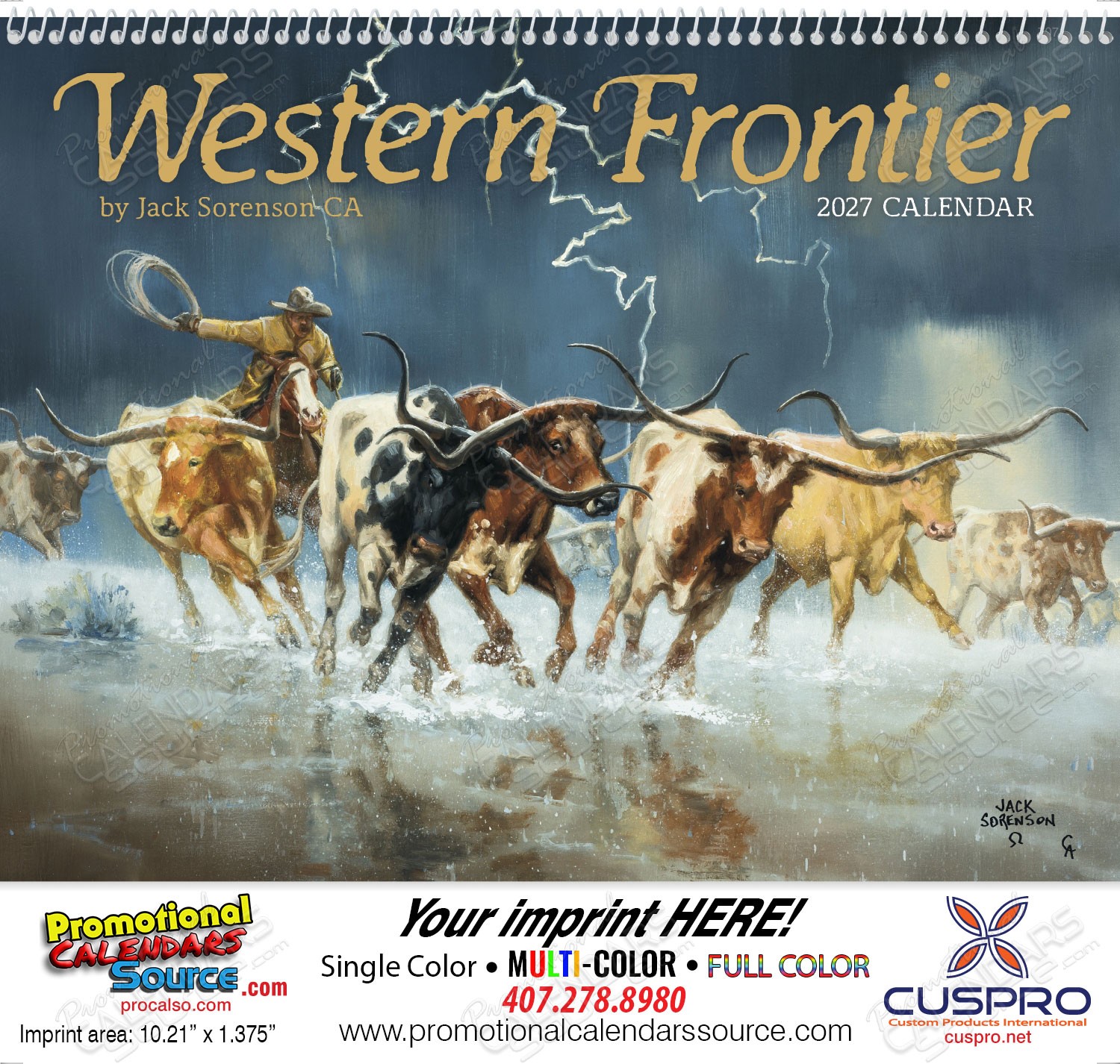 Western Frontier Promotional Calendar Spiral. The skills of Wayne Cooper bring the West to life with the images in this splendid 13 month calendar. Customized Advertising Wall Calendar measuring 11x19 inc. open.