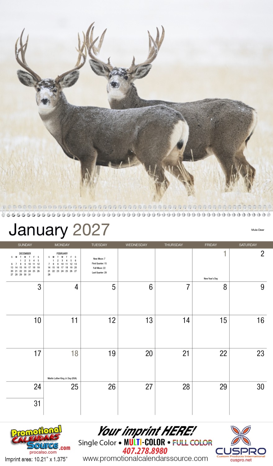 Wildlife Wall Calendar Spiral. Answer the "Call of the wild" every day of the year with this thirteen-month calendar featuring wildlife in their natural habitat, at their best. Spiral Bound calendar. Custom printed with your information will provide year long advertising.