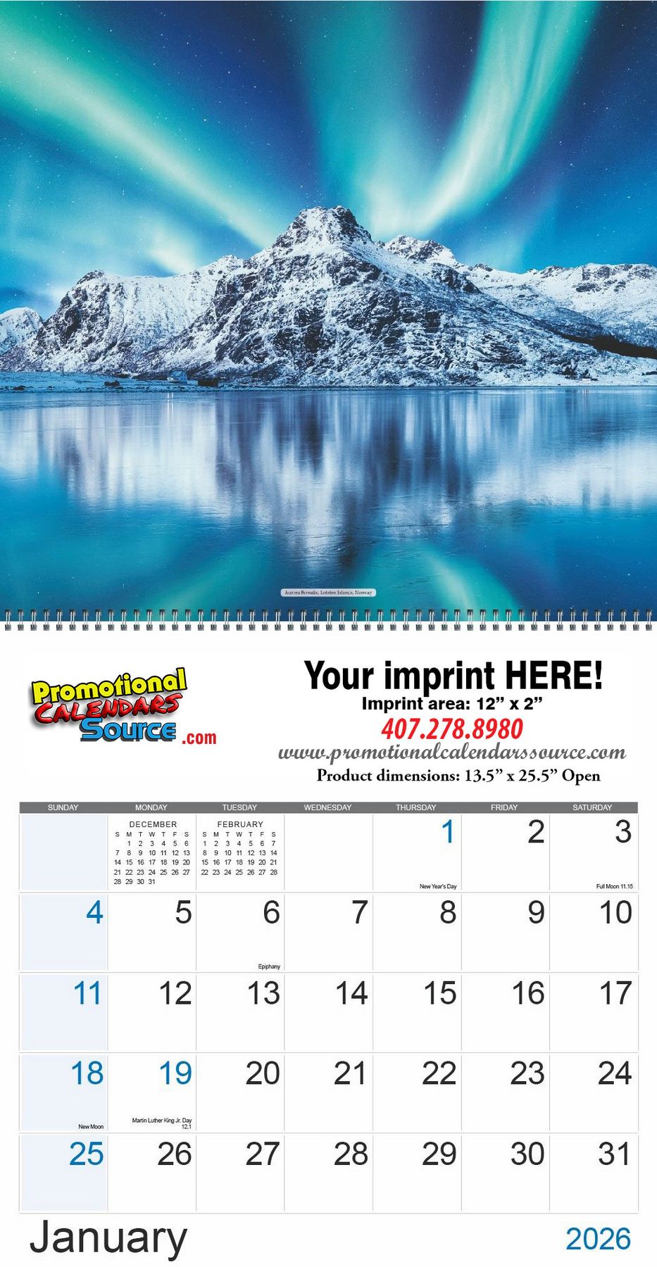 Large scenic Calendar for 2027 with images from around the world. Executive size, mneasures 13.5" x 25.5" Open and has spiral binding. Built with high quality paperstock, (Cover is 110 lb. Gloss Cover Stock with UV Coating; Pad is 75 lb. Gloss Cover Stock with UV coating), and customizable from a single color to Full-Color imprint for your advertising copy. Colorful refreshing images decorate this appointment wall calendar, a 12 month calendar of great quality. The attractive and different desing, will certainly attract attention and be admired all year long, promoting your advertising message. Custom printed with your business information and logo for a year long exposure will be a great and appreciated gift.