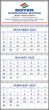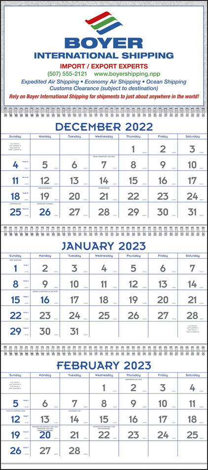 3 Month View Blue & Grey Commercial Planner Calendar Item No. 6602, size 13" x 29" open. Is a 14 months calendar that runs from December of previous year through January of following year.