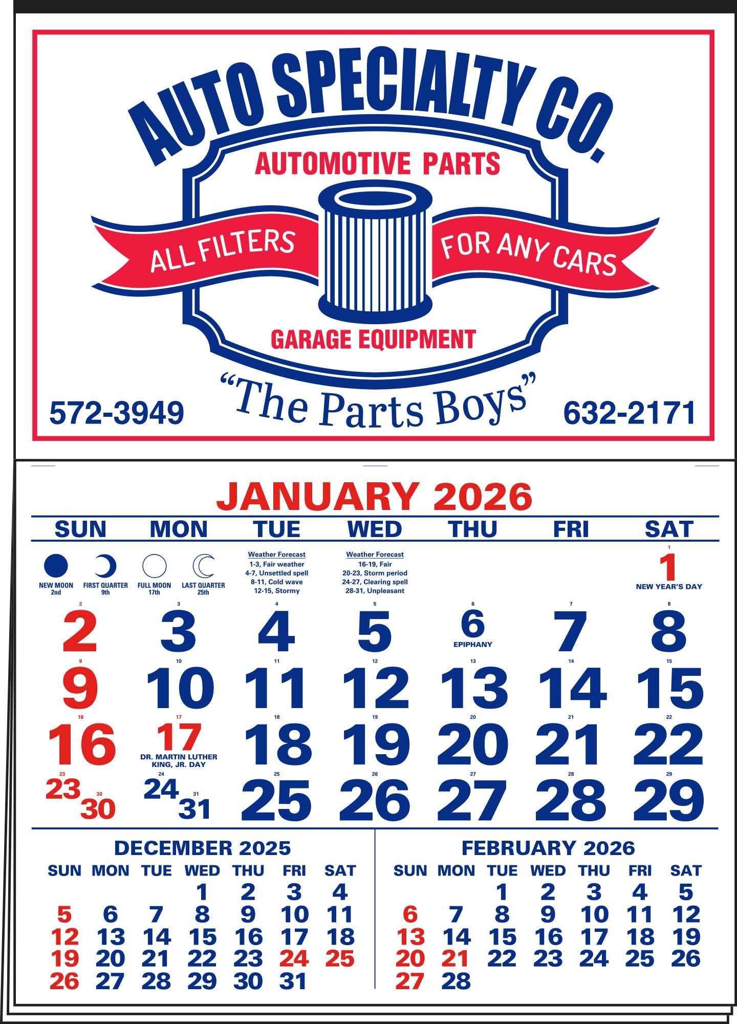 3-Months-In-View Half Apron Calendar with 2-Color Red-Blue Imprint 20.5x28.5