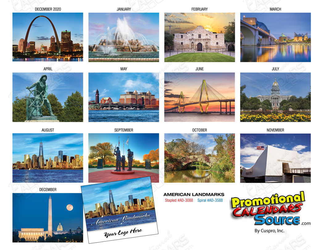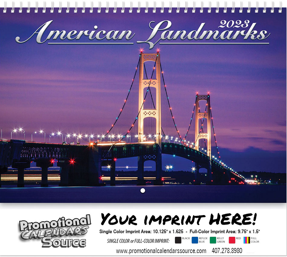 American Landmarks Wall Calendar - Spiral. 13 month wall calendar with double loop spiral binding features high quality photos of historic american landmarks. White House, Golden Gate Bridge, Statue of Liberty and much more. Contact us with your design needs so we can assist you finalize the details of your calendar.