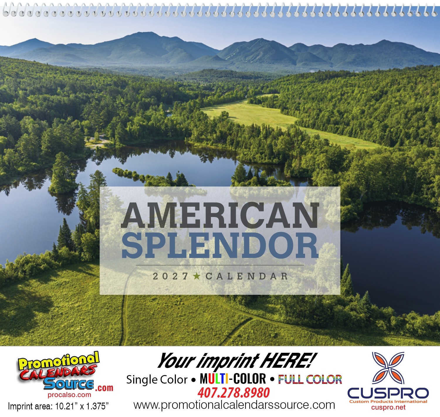 American Splendor Promotional Calendar . Photographs of scenic splendor from every corner of America are featured on this calendar. Appointment style calendar with large date blocks for notes, appointments, reminders and more. 11" x 19" Open Size printed on glossy paper for a quality feel and look. Cover is 80# Cover Gloss Stock and the pad is 70# Text Gloss. Your advertising copy will be printed on the bottom flap, in any single single color or multy color printing option. Perfect to showcase your business information in full color.