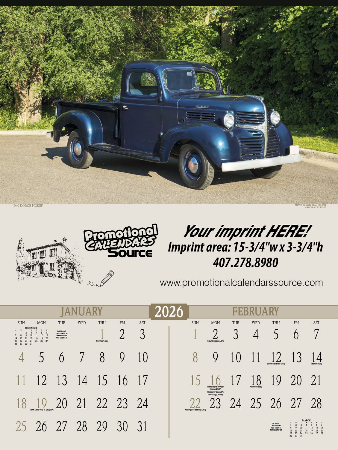 Antique trucks bring history to life in this memorable calendar with descriptions of each vehicle. This calendar is popular for a variety of automotive suppliers and dealers. Large format calendar with plenty of room for your advertising copy. Your ad copy printed in up to 4 colors or four color process.